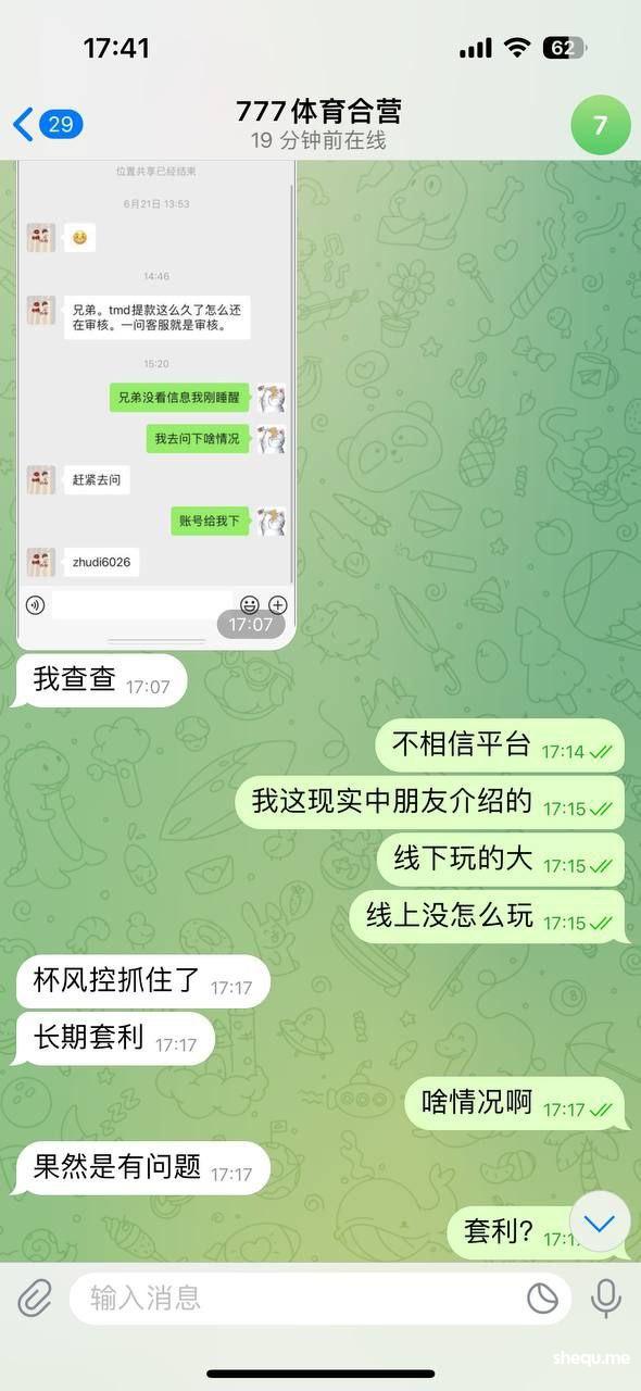 该玩家上月玩的真人输钱了,今早凌晨最后一场欧洲杯玩家想下大额捞亏损,下注决赛大1.5,喜中小两万,凌晨提款到下午十多个小时,后询问招商被告知我该会员长期套利,可是我会员长期未拿过彩金,何来套利?他的注单都是真人体育无任何异常。刚开始做777体育还很忐忑,被告知他们是集团包网,也就放松了警惕心,希望大家以我为鉴